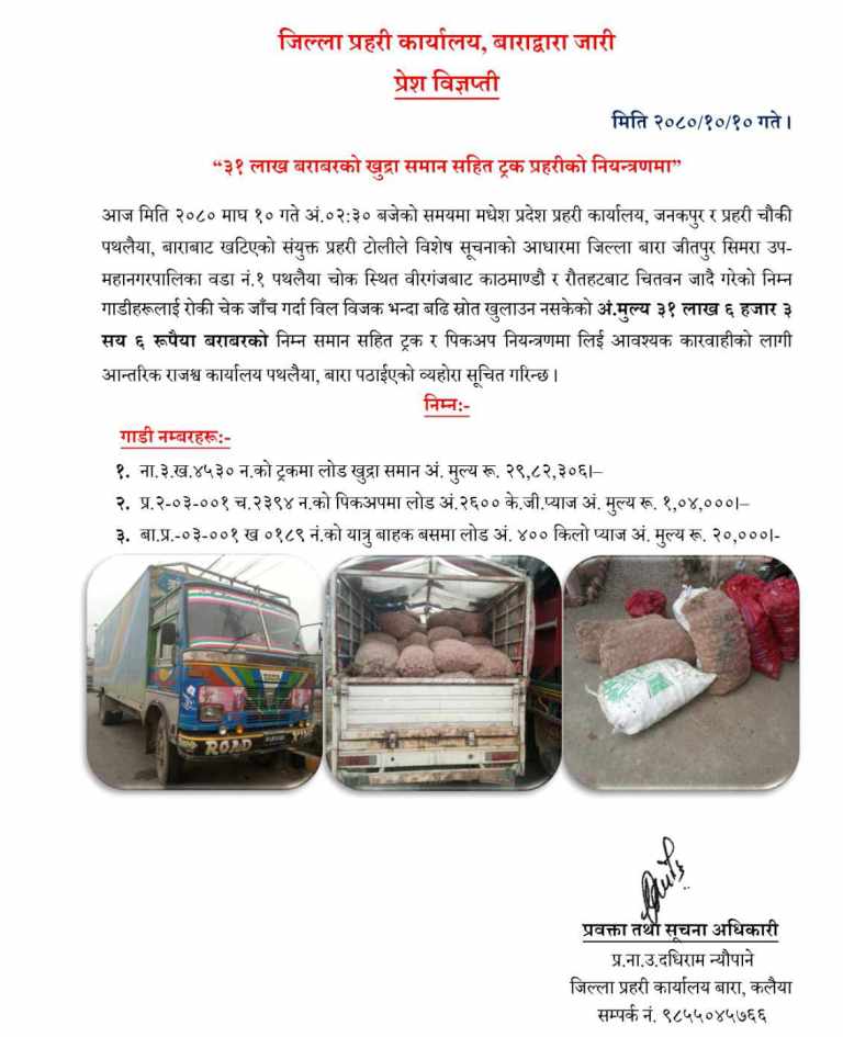 उनका अनुसार ना.३.ख.४५३० नम्बरको ट्रकमा २९ लाख ८२ हजार ३०६ रुपैयाँ बराबरको खुद्रा सामान, प्र.२–०३–००१ च.२३९४ नम्बरको पिकअपमा लोड गरिएको करिब १ लाख ४ हजार रुपैयाँ बराबरको अवैध २ हजार ६०० केजी प्याज र बा.प्र.–०३–००१ ख ०१८९ नम्बरको यात्रु बाहक बसमा लोड गरिएको २० हजार मूल्य बराबरको ४०० किलो प्याज प्रहरीले बरामद गरेको हो ।