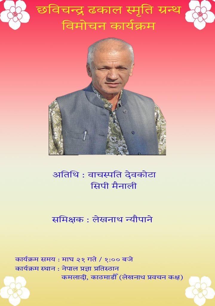 काठमाडाैं । नेपाली कम्युनिष्ट आन्दोलनको दोस्रो पुस्ताका क्रान्तिकारी एवं समाजसेवामा निरन्तर संल्गन रहेका छविचन्द्र ढकालको सम्झनामा स्मृतिग्रन्थ प्रकाशन भएको छ । स्मृतिग्रन्थको सार्वजनिकीकरण यही माघ २१ गते काठमाण्डौमा नेपाल प्रज्ञाप्रतिष्ठानको लेखनााथ सभाकक्षमा हुँदै छ ।