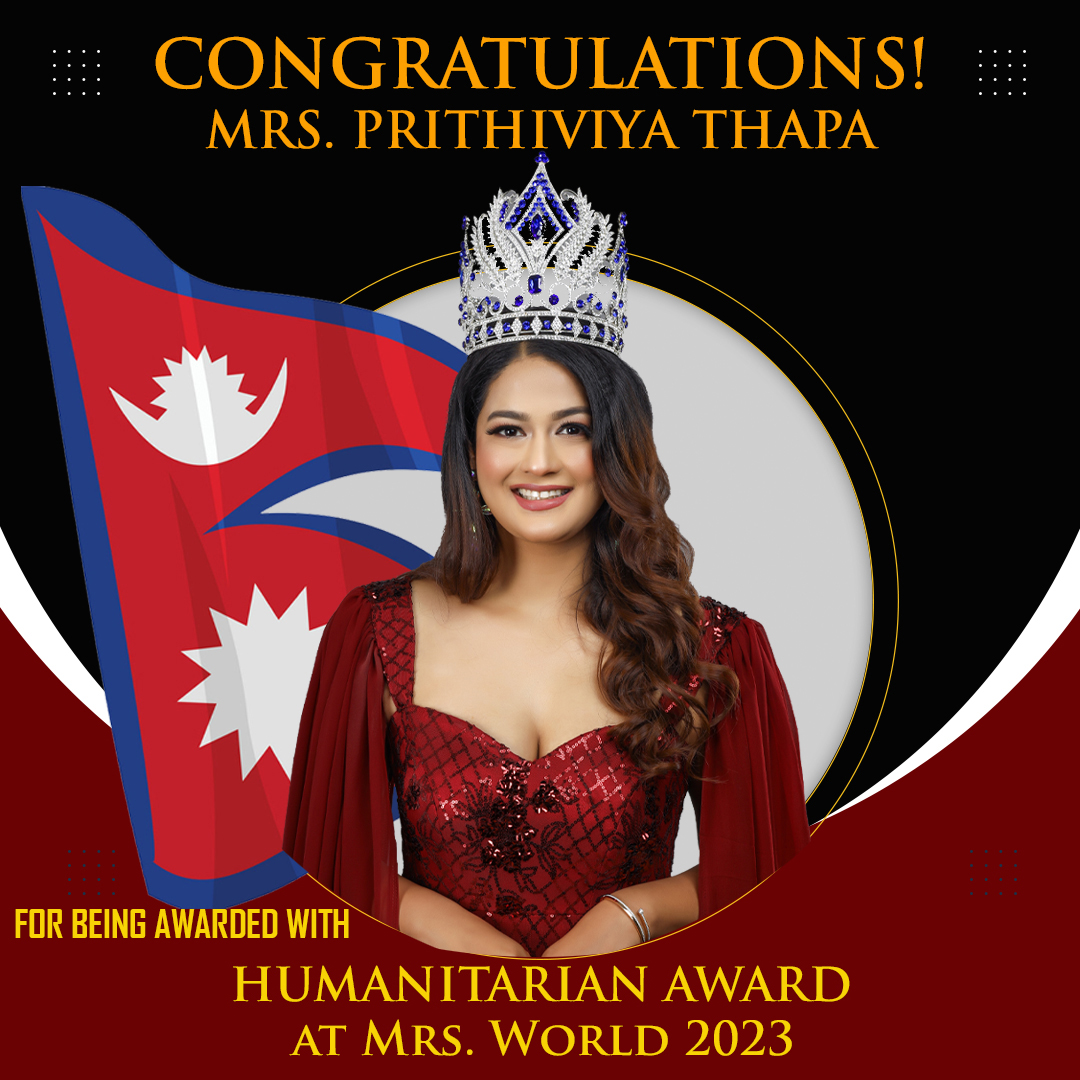 प्रतियोगितामा नेपालको प्रतिनिधित्व गरेर सहभागी भएकी मिसेस नेपाल वल्र्ड पृथ्बीया थापाले ह्युमनिटेरियन अवार्ड जितेकी हुन्। मिसेस वल्र्डमा शिर्ष उपाधिबाहेक अन्य सात उपाधि रहेकोमा आफुले ह्युमनिटेरियन अवार्ड जित्न सफल भएको पृथ्वीयाले बताएकी छन् ।