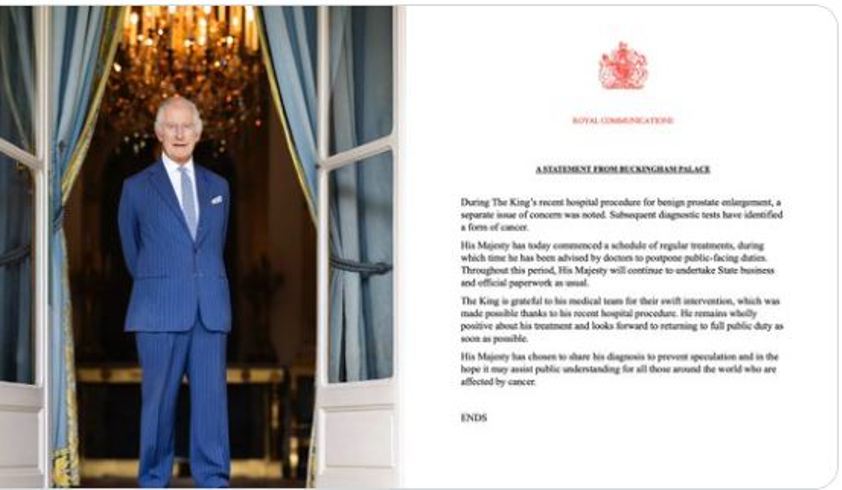लण्डनस्थित बेलायती शाही परिवारको आधिकारिक निवास बकिङ्घम प्यालेसले एक विज्ञप्ति जारी गर्दै प्रोस्टेट ग्रन्थीको हालैको परीक्षणमा चार्ल्सलाई क्यान्सर भएको पाइएको जनाएको थियो ।
