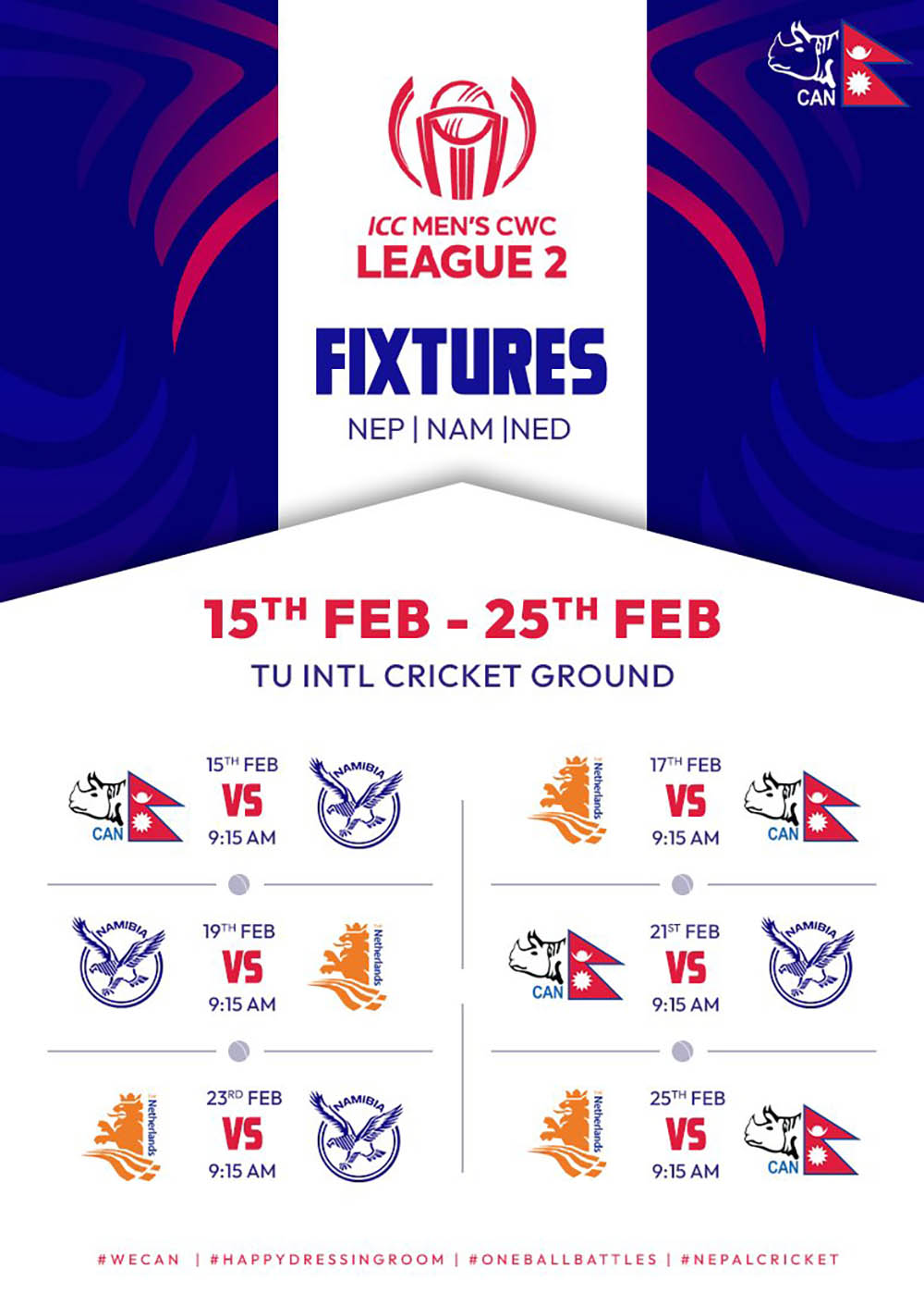 नेपालसहित नामिबिया र नेदरल्याण्डससहितको क्रिकेट विश्वकप कप लिग-२ अन्तर्गतको यो सिरिज फेब्रुअरी १५ अर्थात फागुन ३ देखि २४ अर्थात फागुन १२ गते सम्म काठमाडौँमै हुदै छ ।