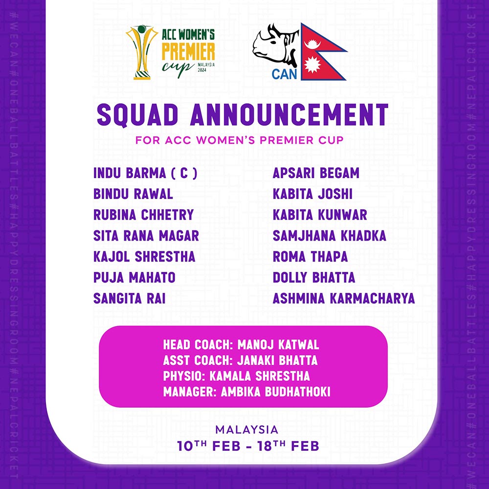 क्यानले इन्दु बर्माको कप्तानीमा एसीसी महिला प्रिमियर कप खेल्ने १४ सदस्यीय टिमको मंगलबार घोषणा गरेको हो । नेपाली महिला राष्ट्रिय क्रिकेट टिममा इन्दु बर्मा (कप्तान), बिन्दु रावल, रुबिना क्षेत्री, सिता राना मगर, काजल श्रेष्ठ, पुजा महतो, संगीता राई, अप्सरा बेगम, कबिता जोशी, कबिता कुँवर, सम्झना खड्का, रोमा थापा, डली थापा र अश्मिना कर्माचार्य रहेका छन् ।