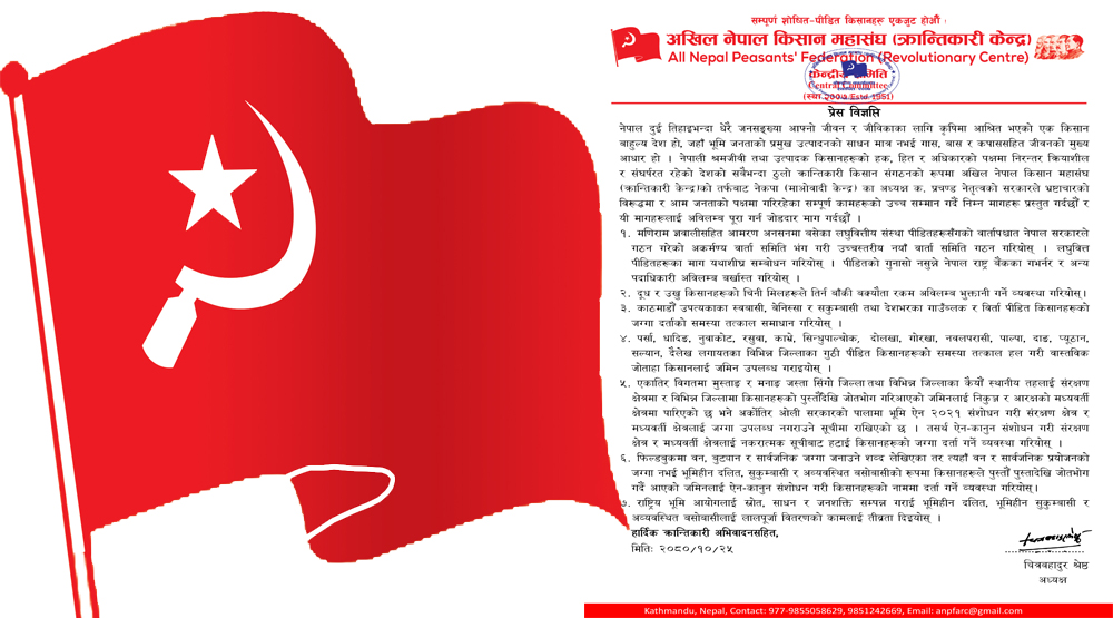 काठमाडाैं । अखिल नेपाल किसान महासंघ (क्रान्तिकारी केन्द्र)ले सरकारसँग विभिन्न सात बुँदे माग राखेको छ । महासंघका अध्यक्ष चित्रबहादु श्रेक्ष्ठले एक विज्ञप्ति जारी गर्दै सरकारले भ्रष्टाचारको विरूद्ध र आम जनताको पक्षमा गरिरहेका सम्पूर्ण कामहरूको उच्च सम्मान गर्दै सात बुँदे प्रस्तुत गरेका हुन् ।