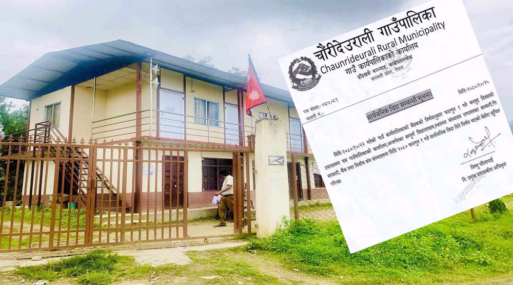काभ्रेपलाञ्चोक । काभ्रेपलाञ्चोकको चौरीदेउराली गाउँपालिकाले सर्वोच्च अदालतको आदेशलाई अवज्ञा गरेको छ । गाउँपालिकाले आगामी फागुन १ गते सार्वजनिक बिदा दिने निर्णय गर्दै सर्बोच्चको आदेशलाई अवज्ञा गरेको हो ।