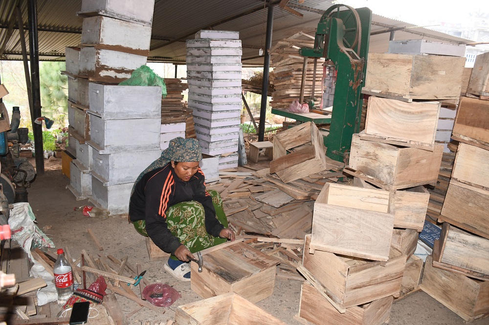 दाङ । दाङको घोराही उपमहानगरपालिका–१३ डुम्मरगाउँ स्थित मौरी पालन पूर्वाधार सामाग्री उत्पादन तथा बजारिकरण उद्योगमा मौरीको घार बनाउँदै महिला कामदार । तस्बिरः कुलदीप न्यौपाने रासस