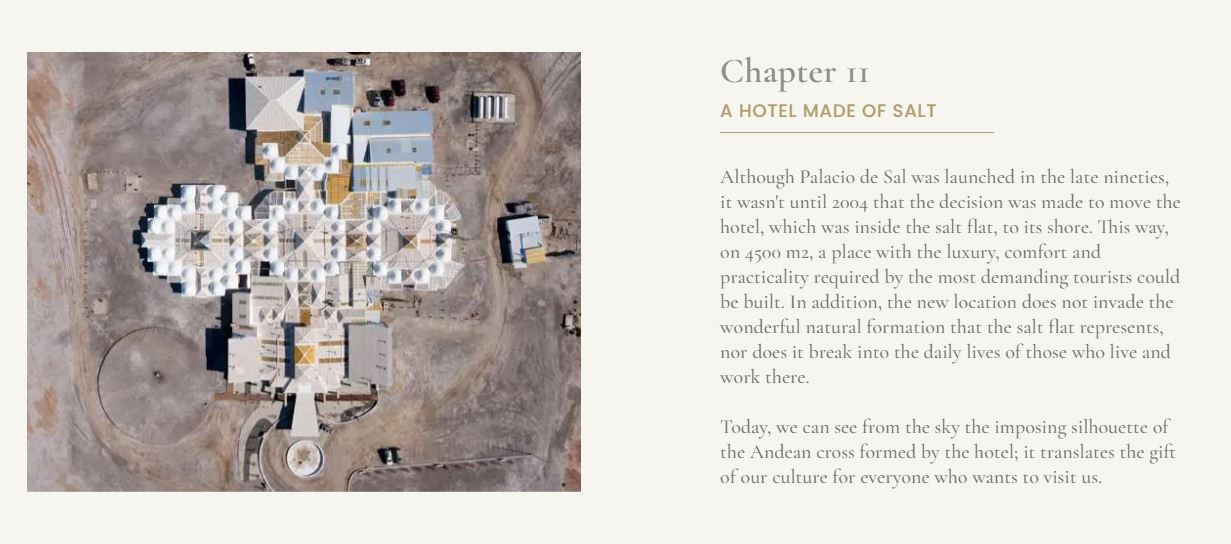 यस होटलका कोठाहरूले दक्षिण अमेरिकाको विशाल मरुभूमिको दृश्य प्रस्तुत गर्दछ। हो, कतिपय ठाउँमा अँध्यारो र कतिपय ठाउँमा हल्का तर चम्किलो रङहरू सेतोसँग तालमेल मिलाउन प्रयोग गरिएको छ। चाखलाग्दो कुरा यो हो कि यहाँ होटलको स्पा अनुभव दिन नुन पानीको बाथ प्रयोग गरिन्छ। बोलिभियास् यो होटल समुन्द्र सतहबाट १२ हजार फिटको उचाइमा छ।