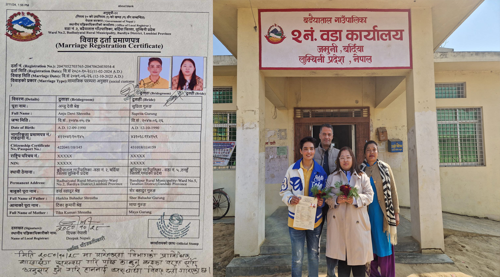 माया गुरुङ्ग र सुरेन्द्र पाण्डेको ६ वर्ष अघि भएको विवाह दर्ता भए पछि उनीहरूले पनि दर्ताका लागि बर्दियाको बढैयाताल गाउँपालिकामा वडा कार्यालयको अविवाहित रहेको सिफारिस सहित निवेदन दिए।