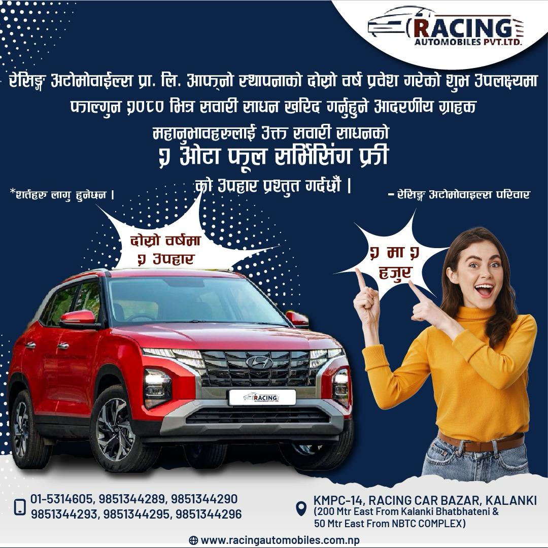 यो कम्पनीले २०८० साल फाल्गुन महिना भित्र गाडी खरिद गर्ने सम्पूर्ण ग्रहकलाई दुई पटक निःशुल्क फूल सर्भिसिङ्ग उपहारको रूपमा दिने भएको हो । रेसिङ अटोमोबाइल्सले आफ्नो व्यवसायिक जीवनको पहिलो वर्ष फलतापूर्वक व्यतीत भएको खुसियालीमा यस्तो उपहार योजना सार्वजनिक गरेको जनाएको छ ।