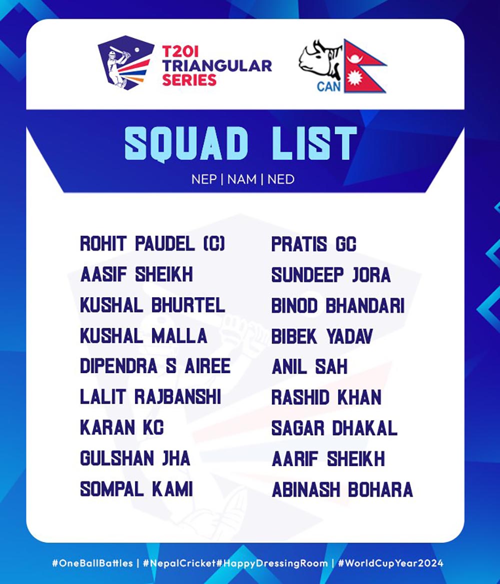 काठमाडौं । नेपाल क्रिकेट संघ (क्यान) ले नामिबिया र नेदरल्याण्डससँग मंगलबारदेखि हुने त्रिकोणात्मक टी-२० सिरिजका लागि टिमको घोषणा गरेको छ । क्यानले आइतबार रोहित पौडेलको कप्तानीमा १८ सदस्यीय टिमको घोषणा गरेको हो ।