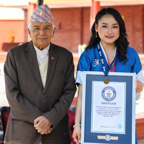 काठमाडौं । सोलुखुम्बुको कालापत्थरमा सर्वाधिक उचाईमा नृत्यको रेकर्ड राख्दै गिनिज बुक अफ वल्र्ड रेकर्डमा नाम दर्ता गराएकी अभिनेत्री छिरिङ शेर्पाले सोमबार राष्ट्रपति रामचन्द्र पौडेलबाट ‘गिनिज बुक अफ वल्र्ड रेकर्ड’को प्रमाणपत्र लिएकी छन् ।