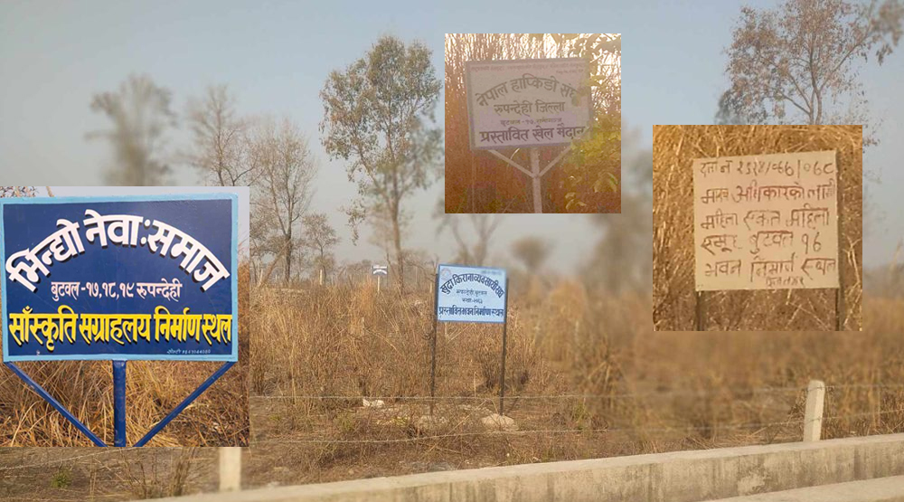 बुटवल । बुटवल उपमहानगरपालिका–१७ रानीगञ्जको सरकारी जग्गा हडप्न एक दर्जन बढी संघसंस्थाले आफ्नो सूचना पाटी राखेका छन् । ती संस्थाले २ कठ्ठादेखि ५ कठ्ठासम्म जग्गा आफूले भवन र अन्य प्रयोजनका लागि कब्जामा लिने उद्देश्यले बोर्ड राखेका हुन् ।