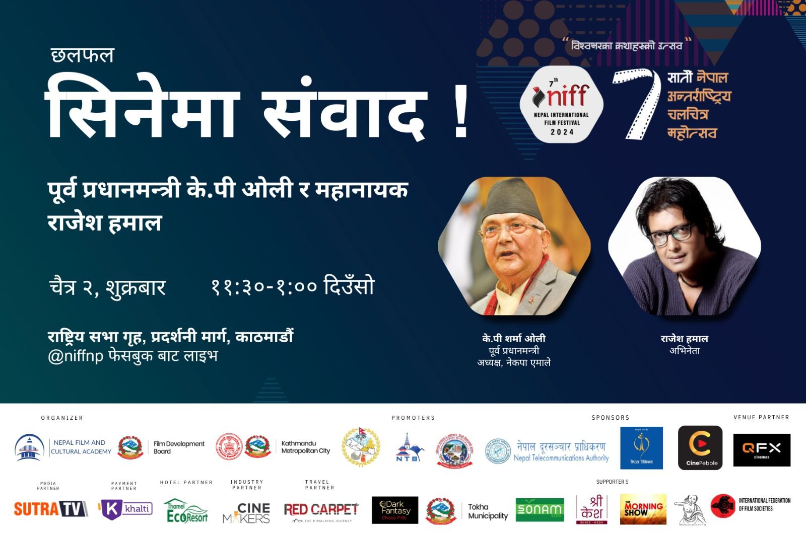 काठमाडौं । अभिनेता राजेश हमालले पूर्वप्रधानमन्त्री केपी ओलीसँग सिनेमा संवाद गर्ने भएका छन् । नेपाल इन्टरनेसनल फिल्म फेस्टिभलको सातौं संस्करणमा सिनेमाका विविध आयाम र विधालाई समेटेर हुने छलफल र अन्तक्र्रियामध्ये एउटा सेसनमा दिग्गज नेता र अभिनेता संवाद गर्ने भएका हुन् ।