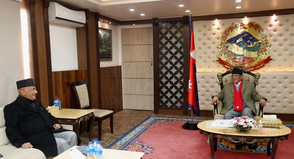 काठमाडौं । प्रधानमन्त्री पुष्पकमल दाहाल ‘प्रचण्ड’ र एमाले अध्यक्ष केपी शर्मा ओलीबिच भेटवार्ता भएको छ । प्रधानमन्त्रीको सरकारी निवास बालुवाटारमा सोमबार बिहान प्रधानमन्त्री प्रचण्ड र अध्यक्ष ओलीबिच भेटवार्ता भएको हो ।