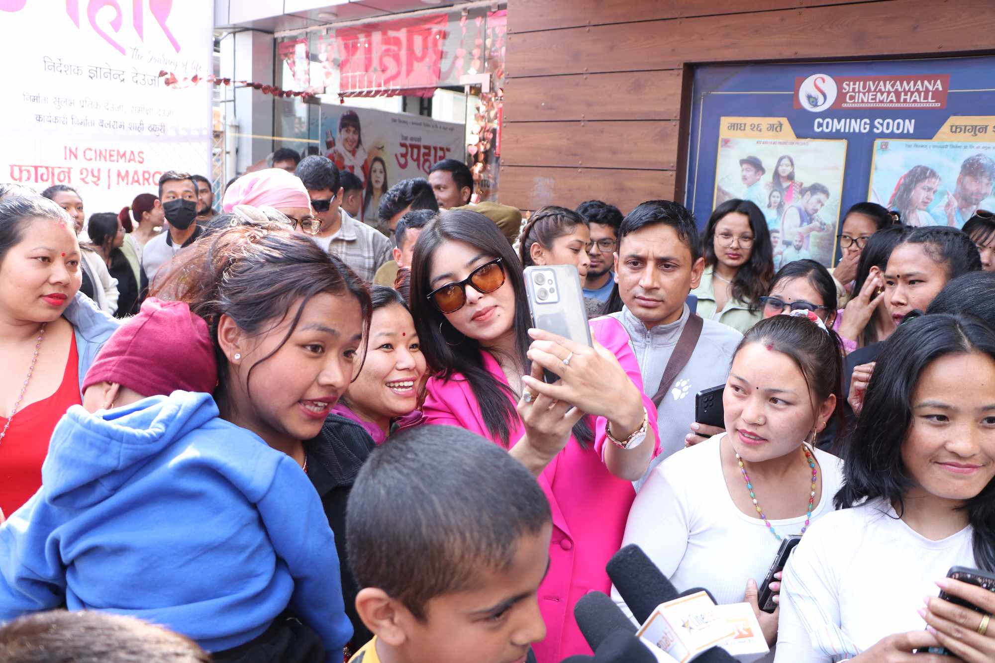 अभिनेत्री पूजा शर्मा फिल्म रिलिज भएपछि हरेक दिन दर्शकको प्रतिक्रिया बुझ्न हल–हल पुगिरहेकी छन् । यही क्रमलाई निरन्तरता दिँदै उनी सोमबार फिल्मको टिमसहित बनेपाको शुभकामना हल पुगेकी हुन् । शुक्रबार र शनिबार उपत्यकाका हलमा दर्शकमाझ अन्तरक्रिया गरेकी पूजा सोमबार बनेपा पुगेकी हुन् ।