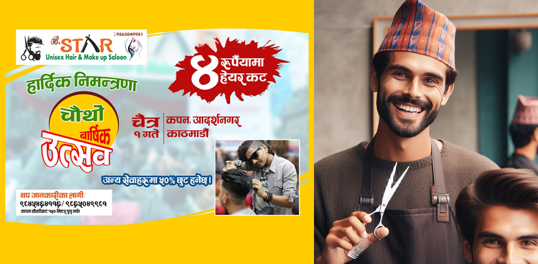 काठमाडौँ । बि स्टार एकेडेमी एण्ड युनिसेक्स सैलून आदर्शनगर, कपनको चौथो वार्षिकोत्सवको अवसरमा विभिन्न अफर ल्याएकाे छ । चौथो वार्षिकोत्सवमा सौन्दर्य सम्बन्धी सम्पूर्ण सेवा ५० प्रतिशत डिसकाउण्ट प्राप्त गर्न सकिने अफर ल्याएको हाे ।