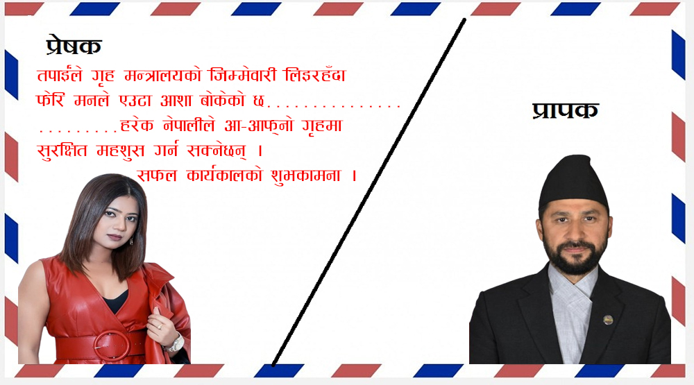 उपप्रधान तथा गृहमन्त्री लामिछानेलाई सामाजिक सञ्जालमार्फत् खुलापत्र लेख्दै अभिनेत्री केकीले भनेकी छिन्, ‘यही आशा छ, तपाईंले गृह मन्त्रालयको जिम्मेवारी लिइरहँदा हरेक नेपालीले आ–आफ्नो गृहमा सुरक्षित महशुस गर्न सक्नेछन् ।’