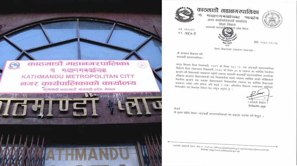 महानगरपालिका अन्तर्गतको शिक्षा विभागद्वारा जारी सूचनामा नेपालीपन झल्कने गरी विद्यालयको नामकरण गर्नका लागि प्रक्रिया अघि बढाई एक महिनाभित्र विद्यालय व्यवस्थापन समितिको निर्णयसहित निवेदन पेस गर्न सबै निजी विद्यालयहरुलाई अनुरोध गरिएको छ ।