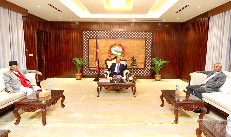 काठमाडौं । प्रधानमन्त्री एवं नेकपा (माओवादी केन्द्र) का अध्यक्ष पुष्पकमल दाहाल प्रचण्ड, नेकपा (एमाले) का अध्यक्ष एवं पूर्वप्रधानमन्त्री केपी शर्मा ओली र नेपाली कांग्रेसका सभापति एवं पूर्वप्रधानमन्त्री शेरबहादुर देउवाबीच भेटवार्ता भएको छ ।