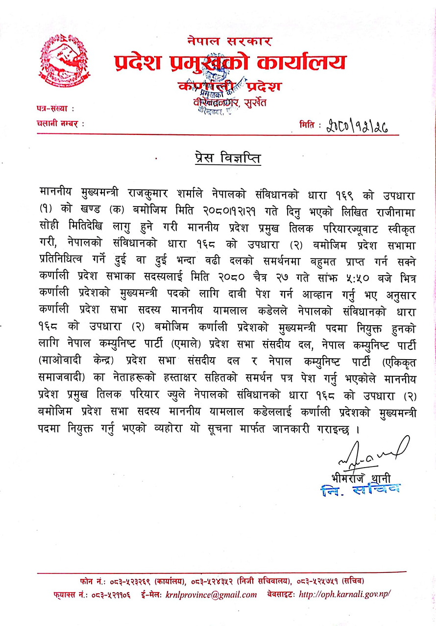 यस अघि आजै नेकपा एमाले, नेकपा माओवादी केन्द्र र एकीकृत समाजवादीका २३ सांसदको हस्ताक्षरसहित नयाँ सरकार गठनका लागि प्रदेश प्रमुख तिलक परियारसमक्ष दाबी पेस गरिएको थियो ।