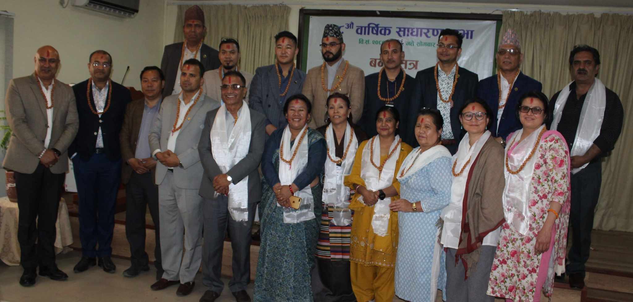 सोमबार सम्पन्न भएको साधारणसभाले निवर्तमान अध्यक्ष प्रेमराज तिवारी, वरिष्ठ उपाध्यक्षमा लैकु लामा, प्रथम उपाध्यक्षमा प्रसुन सत्याल, द्वितीय उपाध्यक्षमा नवराज शर्मा, महासचिवमा प्रवीनकुमार वास्तोला, सचिवमा शोभाकान्त बस्याल र कोषाध्यक्षमा सकलसिंह रोकायलाई निर्वाचित गरेको छ ।
