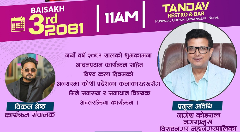 बिराटनगर महानगरपालिकाका नगरप्रमुख नागेश कोइराला प्रमुख अतिथी रहने कार्यक्रम बिराटनगरको पुष्पलाल चोकमा अवस्थित ताण्डब रेस्ट्रो एण्ड क्याफेमा बिहान ११ बजेदेखी सुरु हुने छ ।