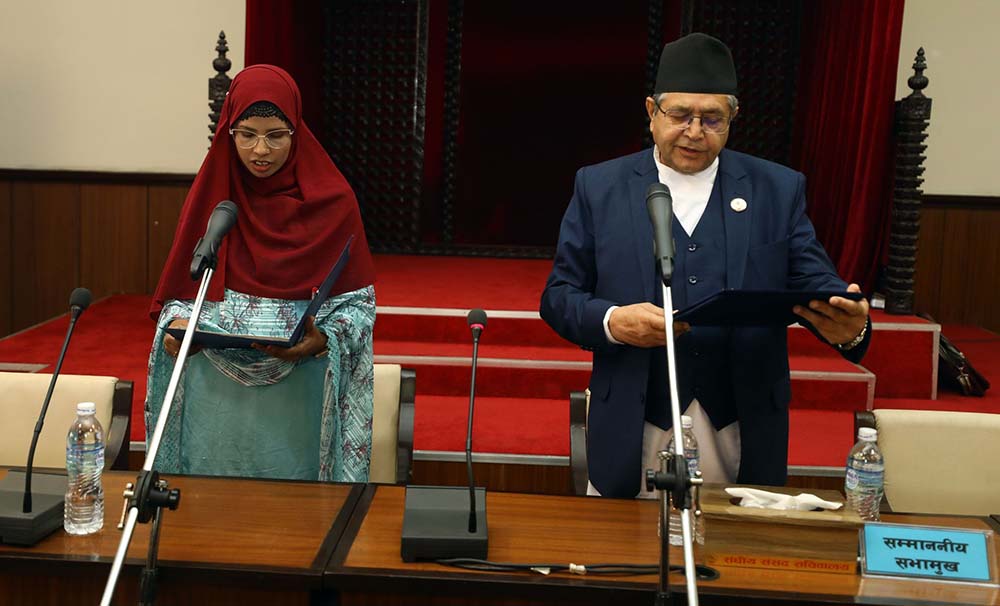 काठमाडौँ । सभामुख देवराज घिमिरले प्रतिनिधिसभामा समानुपातिक निर्वाचन प्रणालीद्वारा नवनिर्वाचित सांसद हसिना खानलाई पद तथा गोपनीयताको सपथ गराएको छन् ।