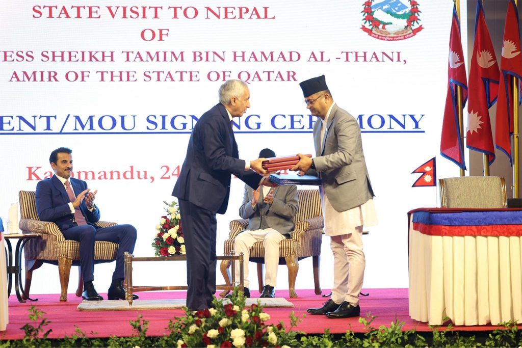 कतारका अमिर थानी र प्रधानमन्त्री पुष्पकमल दाहाल ‘प्रचण्ड’बीच आज सोल्टी होटलमा भएको द्विपक्षीय भेटवार्तापछि कला र संस्कृतिका क्षेत्रमा सहकार्य, नेपाल र कतारका सरकारी समाचार एजेन्सीबीच समाचार आदानप्रदान तथा शिक्षाका क्षेत्रमा सहयोग आदानप्रदानसम्बन्धी समझदारी पत्रमा हस्ताक्षर भएको छ ।