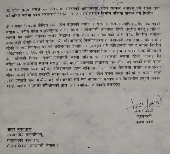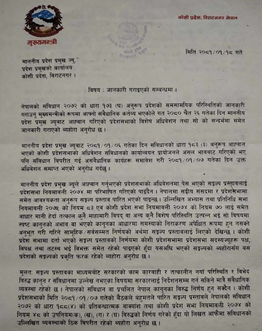 विराटनगर। कोशी प्रदेशका मुख्यमन्त्री केदार कार्कीले गैरसंवैधानिक अभ्यास नगर्न आग्रह गर्दै प्रदेश प्रमुखलाई पत्र लेखेका छन्। मुख्यमन्त्री कार्कीले मंगलबार प्रदेश प्रमुख परशुराम खापुङलाई भेटेर पत्र बुझाउदै गैरसंवैधानिक अभ्यास नगर्न आग्रह गरेका हुन्।