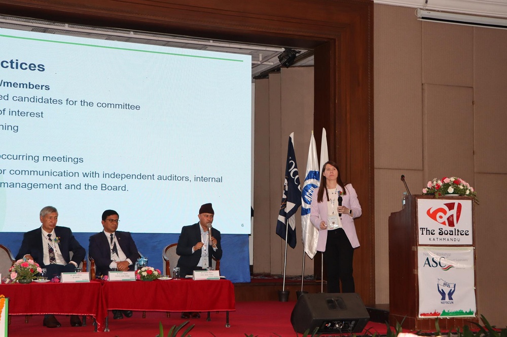 उनले कार्यपत्र प्रस्तुत गर्दै अन्तर्राष्ट्रिय अभ्यास जानकारी गराउँदै आन्तरिक तथा बाह्य लेखा परिक्षकको परिवर्तन गरिनु पर्ने, सञ्चालक समितिको बैठकमा लेखा सुपरिवेक्षण समितिको सुझाव छलफल गर्नु पर्ने र समितिका प्रतिवेदनहरु परीक्षण गरिएको तथा आवश्यक सुधार गरिएको सुनिश्चित गर्नु पर्ने बताइन् ।