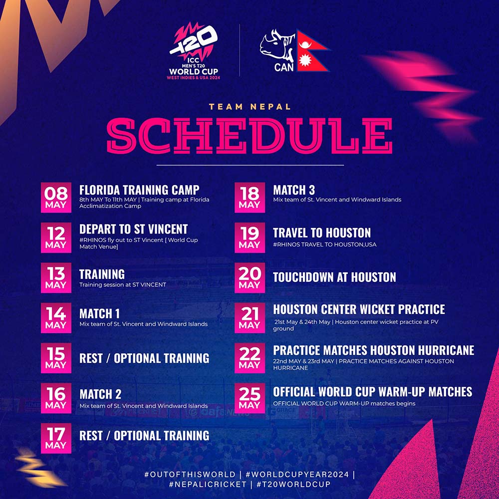 जस अनुसार नेपाली टिमले ८ मे देखि ११ मे सम्म फ्लोरिडामा ट्रेनिङ क्याम्प गर्ने छ । त्यस्तै १२ मे मा नेपाली टिम सेन्ट भिनसेन्ट जाने र १९ मे सम्म रहने जानकारी दिएको छ ।