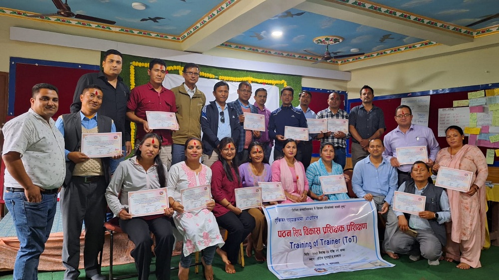 शारदा नगरपालिका र बागचौर नगरपालिका का १३ जना प्रशिक्षक लाई रुम टु रिडको प्राविधिक सहयोग तथा मानव संसाधन बिकास केन्द्र, सुर्खेतको सहकार्यमा प्रशिक्षक प्रशिक्षण तालिम संचालन गरिएको हो । गत मंगलबार देखि शनिबार सम्म एकीकृत पाठ्यक्रममा आधारित प्रारम्भिक कक्षामा पठन सीप विकास सम्बन्धी प्रशिक्षक प्रशिक्षण तालिम संचालन गरिएको हो ।