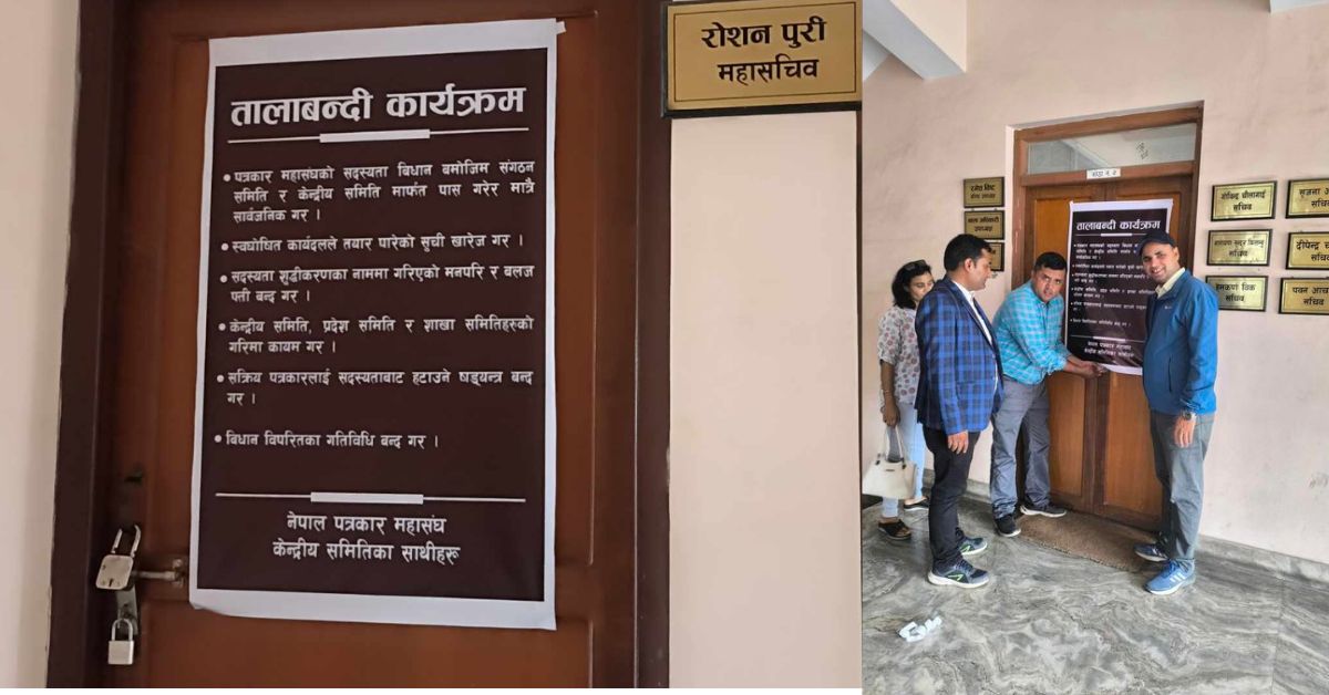 महासंघले गैर पत्रकारहरूलाई समेटेर पत्रकारहरूको सदस्यताको अन्तिम नामावली प्रकाशित गरेको आरोप लगाउँदै खारेजीको माग गर्दै सोमबार सञ्चारग्रामस्थित महासंघको केन्द्रीय कार्यालयको मुल गेटमा तालाबन्दी गरिएको हो।