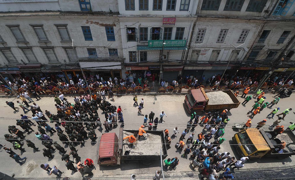 न्युराेडमा विवाद बढ्दै गएकाे र प्रहरीसमेत उपस्थित भएपछि नगरप्रहरी फर्किएका हुन् । केही दिनअघि काठमाडौं महानगरले फुटपाथ फराकिलो बनाउनेभन्दै सडकका किनारा भत्काएको थियो । भत्काएको सडक आज सडक विभागले पुर्न थालेको हो । सडक विभागले काम थालेको थाहा पाएपछि मेयर बालेन्द्र साहले नगरप्रहरी पठाएका थिए ।