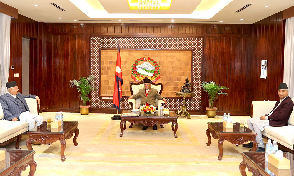 काठमाडौं । प्रधानमन्त्री पुष्पकमल दाहाल प्रचण्ड, एमालेका अध्यक्ष केपी शर्मा ओली र कांग्रेस सभापति शेरबहादुर देउवाबीच भेटवार्ता भएको छ । प्रधानमन्त्री निवास बालुवाटारमा शीर्ष तीन नेताबीच भेटवार्ता भएको हो ।