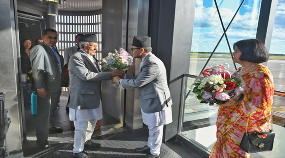 राष्ट्रपति पौडेल नेतृत्वको प्रतिनिधिमण्डललाई शनिबार अपराह्न बर्लिन ब्रान्डेनवर्ग अन्तरराष्ट्रिय विमानस्थलमा जर्मनीका लागि नेपालका राजदूत रामकाजी खड्का तथा उनकी धर्मपत्नी, जर्मनीका राष्ट्रपतिको सङ्घीय परराष्ट्रमामिला कार्यालयका वरिष्ठ अधिकारीले स्वागत गरेका बर्लिनस्थित नेपालको राजदूतावासले आज जनाएको छ ।