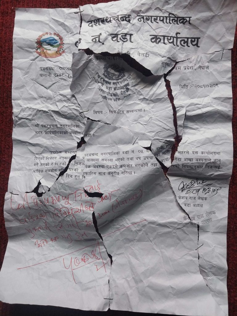 बैतडी । बैतडीको दशरथचन्द नगरपालिका वडा न. ५का सातजना विपन्न नागरिकहरुले आर्थिक सहायताका लागि वडामा अनुरोध गरे अनुसार वडा न।५का अध्यक्ष केशव दत्त लेखक नगरपालिकालाई सिफारिस लेख्छन् ।