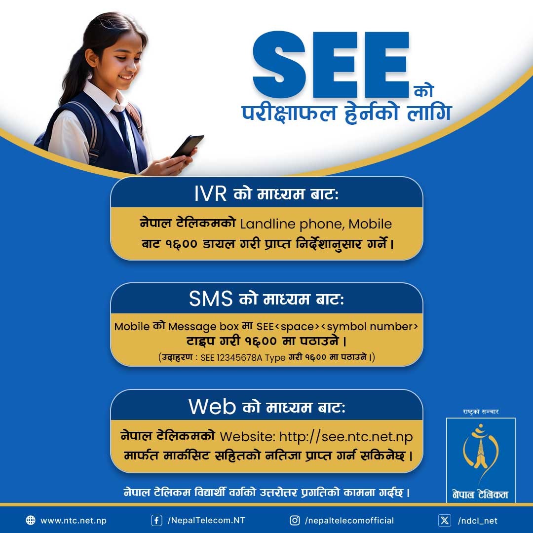 नतिजा विभिन्न माध्यमबाट हेर्न सकिन्छ । नेपाल टेलिकमले एसईई परीक्षाको नतिजा प्राप्त गर्नका लागि विभिन्न व्यवस्था गरेको छ । परीक्षाको नतिजा आईभीआर, एसएमएस तथा वेबसाइटमार्फत् प्राप्त गर्न सकिने टेलिकमले जनाएको छ ।