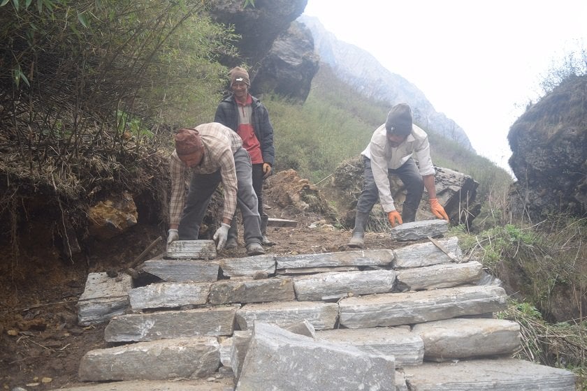 म्याग्दी । सोलुखुम्बुका खड्क बस्नेत दुई महिनादेखि धवलागिरि हिमालको फेदी नजिकको जङ्गलमा बास बस्छन् । म्याग्दीको रघुगङ्गा गाउँपालिका–७ चिमखोलाको कछुवा ओढार क्षेत्रमा पदमार्ग बनाउन बस्नेतसहित करिब ३० जनाको टोली दुई महिनादेखि जङ्गलमै बास बस्दै आएका हुन् । म्याग्दी र मुस्ताङलाई पदमार्गले जोड्ने धवलागिरि आइसफल ट्रेकमा दुई वर्षदेखि पदमार्ग निर्माण भइरहेको छ ।