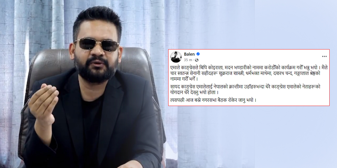 आजको बैठकमा यसैलाई लिएर विवाद भएको बुझिएको छ । बालेनले फेसबुकमा स्टाटस लेख्दै कांग्रेस(एमालेले बैठक रोकेको आरोप लगाएका छन् ।