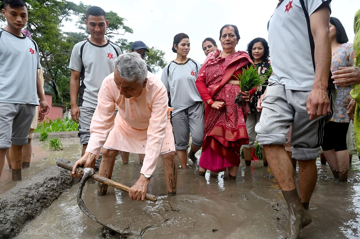रोपाइँ शुभारम्भ गर्दै राष्ट्रपति पौडेलले कृषि पेसा, श्रमको सम्मानको संस्कृति र धान उत्पादनलाई प्रोत्साहन दिन प्रतीकात्मक रुपमा रोपाइँमा सहभागी भएको बताए।