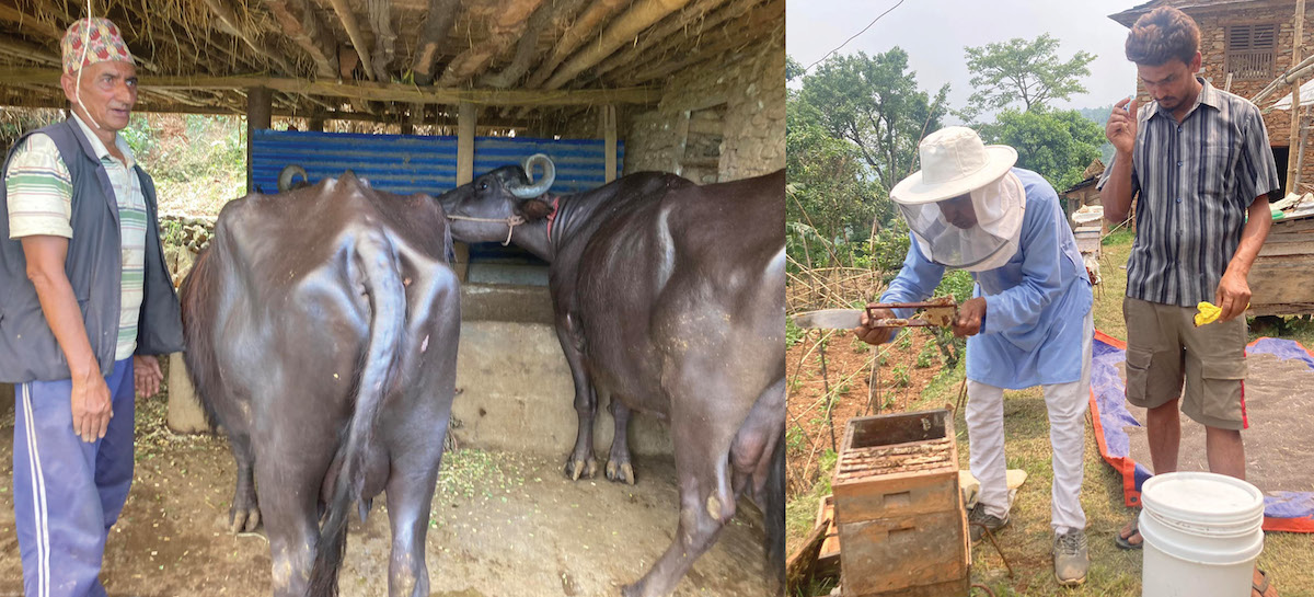 'चार वर्ष अगाडिसम्म छोरा चितवनमा माछापालन गरेर बस्थ्यो। घरमा दुई-चारवटा मौरीका घार र एउटा लैनो भैंसी थियो। कोरोनापछि छोरा घर फर्कियो र व्यावसायिक पशुपालनमा लाग्यौं,' रघुनाथले भने, 'अहिले बाउछोरा मिलेर ६ वटा मुर्रा क्रस जातका भैंसी र तीनवटा गाई पालन गरेका छौं। २६ वटा मौरीका घार छन्। मौरीका घार बढाएर ५० पुर्याउने तयारीमा छौं।'