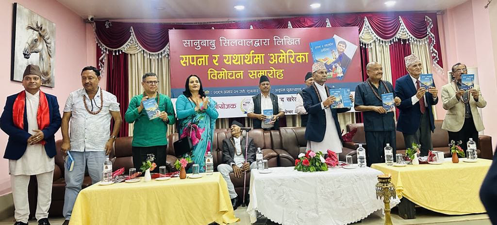 काठमाडौं । सानुबाबु सिलवालको ‘सपना र यथार्थमा अमेरिका’ पुस्तक एक समारोहका बीच विमोचन गरिएको छ । शुक्रबार काठमाडौंको वत्तिसपुतलीमा मन्त्रीपरिषदका पूर्वअध्यक्ष खिलराज रेग्मी लगायतका व्यक्तित्वहरुको हातबाट पुस्तक विमोचन गरिएको हो ।