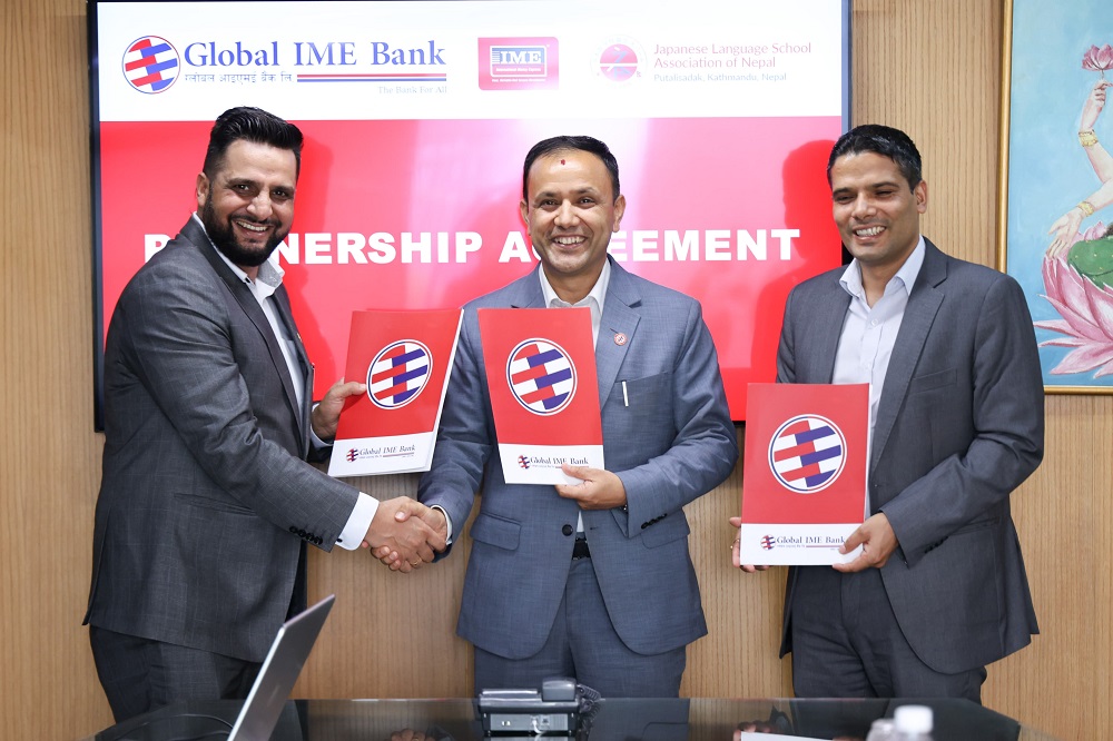काठमाडौं । ग्लोबल आइएमई बैंक लिमिटेड, आइएमई लिमिटेड तथा जापानिज भाषा विद्यालय संघ नेपाल (जाल्सान) बिच त्रिपक्षीय समझदारी पत्रमा हस्ताक्षर भएको छ ।