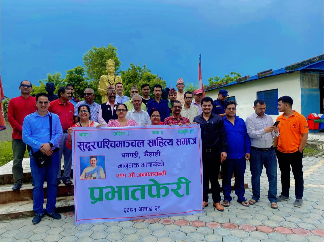 साहित्य समाजले आदिकवि भानुभक्त आचार्यको २११औं जन्मजयन्तीका उपलक्ष्यमा प्रभातफेरी गर्नुका साथै पुस्तकमाथि परिचर्चा गरेको हो । प्रभातफेरी भानुभक्तीय रामायणका श्लोकले गुन्जाएमान पारिएको थियो ।
