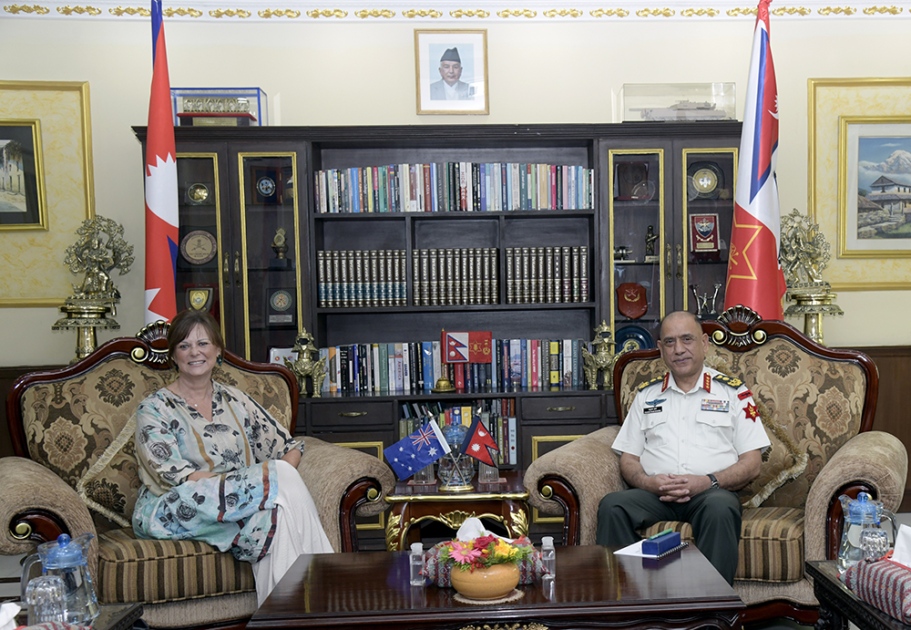 काठमाडौं । प्रधानसेनापति प्रभुराम शर्मा र नेपालका लागि अष्ट्रेलियाका महामहिम राजदूत फेलिसिटी भोल्कबीच जङ्गी अड्डामा शिष्टाचार भेट भएको छ ।