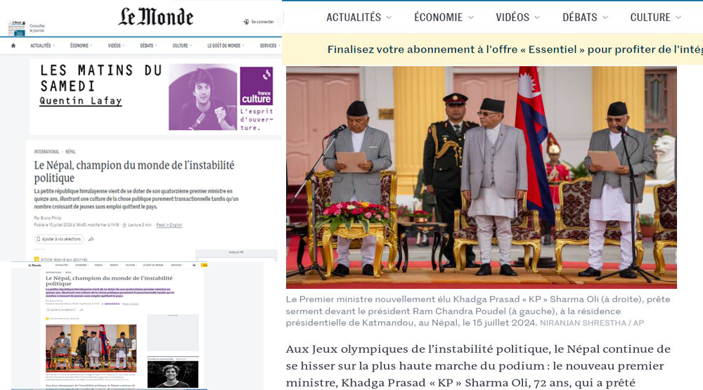 मंगलबार प्रकाशित उक्त समाचारको ‘लिडलाइन’ मै पत्रिकाले ‘राजनीतिक अस्थिरताको ओलम्पिक खेलमा नेपालले शीर्ष स्थान कायम राखेको छ,’ भन्ने उल्लेख छ । प्रधानमन्त्रीका रूपमा आइतबार सपथ खाएका केपी शर्मा ओली विगत १५ वर्षमा बनेका चौधौं प्रधानमन्त्री रहेको ‘ले मोन्डे’ ले लेखेको छ ।