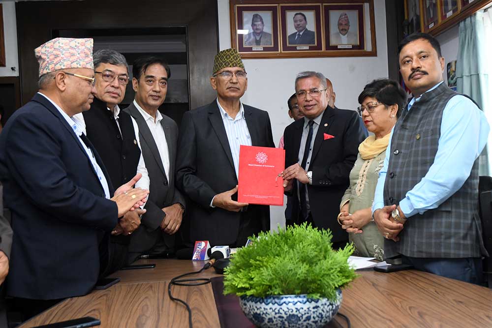काठमाडौं । नेपाल चेम्बर अफ कमर्सले नवनियुक्त उपप्रधान एवं अर्थमन्त्री विष्णु पौडेलसंग अर्थमन्त्रालयमा शुक्रबार भेटवार्ता गरेको छ । नीतिगत स्थायित्व र अर्थतन्त्रलाई चलायमान बनाउन ४० बुँदे सुझाव सहित चेम्बर कार्यसमितिले नवनियुक्त अर्थमन्त्री पौडेलसमक्ष सिंहदरवारमा भेतबार्ता गरेको हो ।