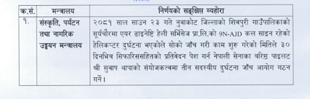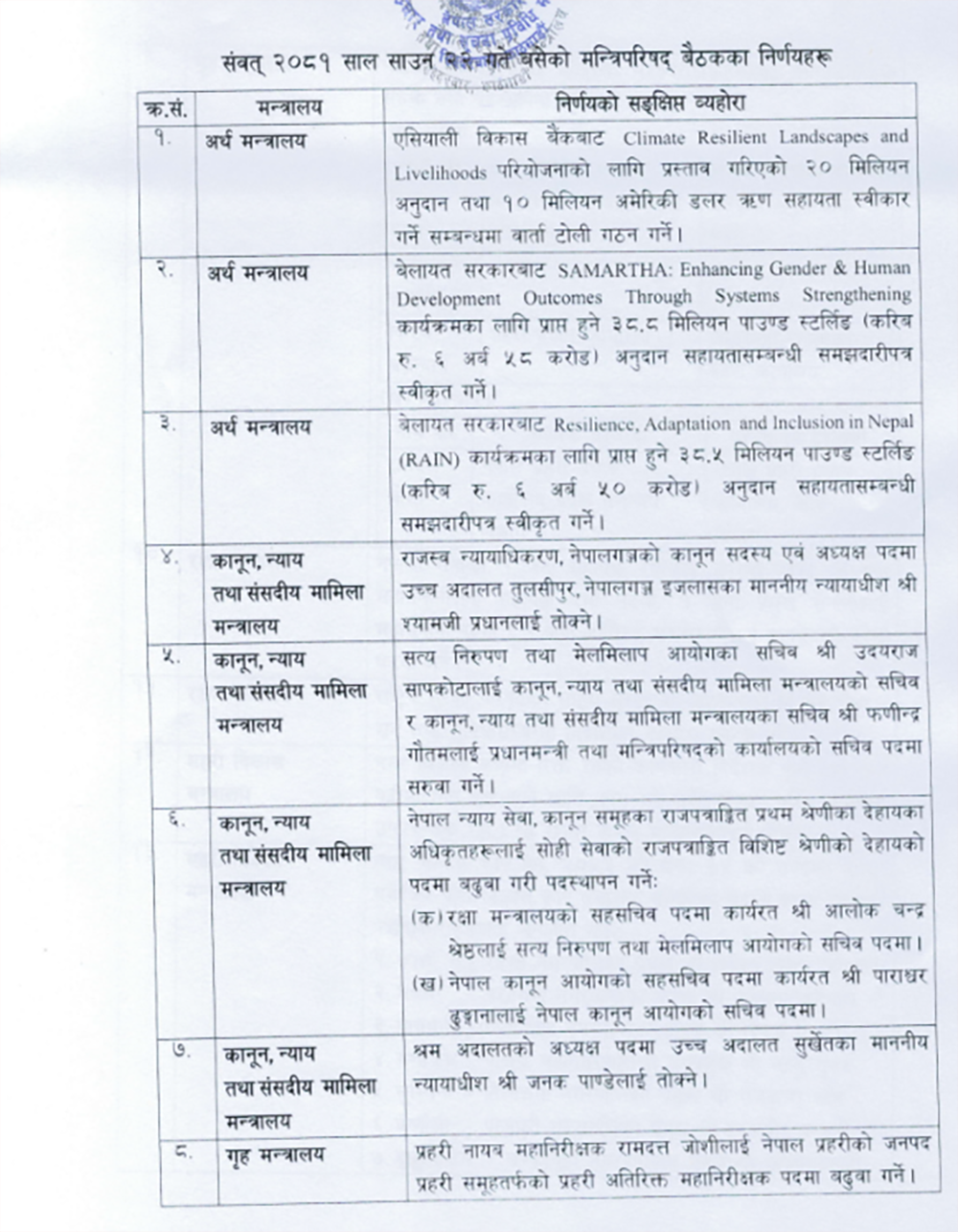 काठमाडौँ । सरकारले यहि साउन २२ र २३ गते बसेको मन्त्रिपरिषद्को बैठकका निर्णयहरु सार्बजनिक गरेको छ ।