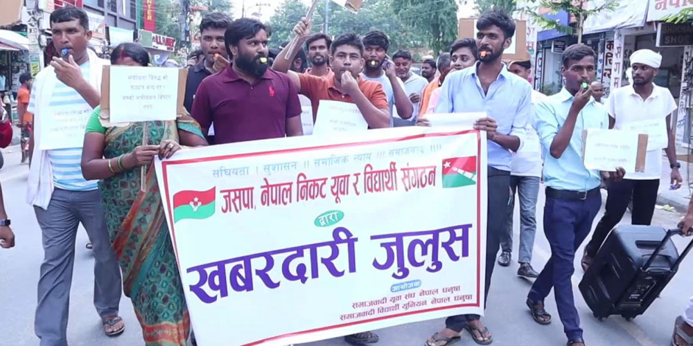 जसपा नेपाल निकटको युवा संगठन तथा विद्यार्थी संगठनले संयुक्त रुपमा मधेस सरकारको जम्बो मन्त्रीपरिषद्लाई सानो आकारको बनाउन माग गर्दै जनकपुरधाम नगरभित्र सिट्टी जुलुश निकालेर विरोध प्रदर्शन गरेको हो ।