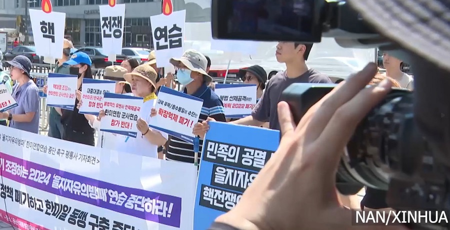 दक्षिण कोरिया। दक्षिण कोरियाली शान्ति समूहहरूले संयुक्त राज्य अमेरिकासँग देशको संयुक्त सैन्य अभ्यासको विरूद्ध विरोध र्याली निकालेका छन् ।
